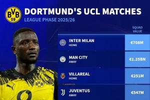 体育资讯8月29日讯 本赛季欧冠联赛阶段对阵抽签结果出炉,德国转会市场盘点了多特对手的身价。